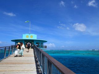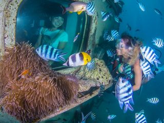 ピティ湾の真ん中(水深10m)に設置されたフィッシュアイ海中展望塔へ到着。360度全方位に設置された海中観察窓から、200種類以上のトロピカルフィッシュ達が生息する本物のサンゴ礁の海中をのぞいてみましょう!