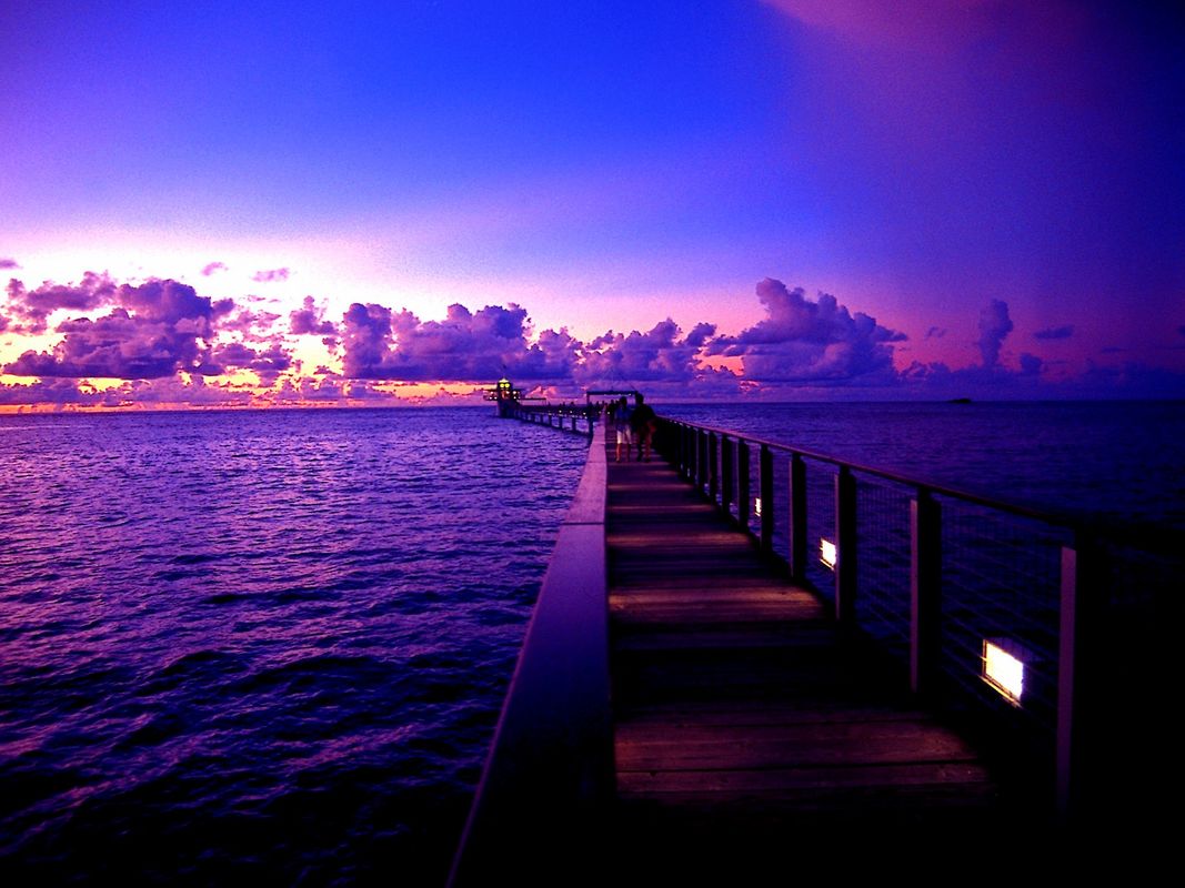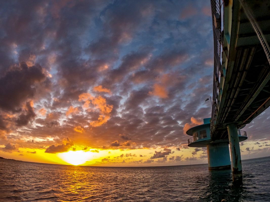 塔に入るために桟橋を歩きます。まずは日が暮れる前に、透明度抜群の海を眺める海上散歩をお楽しみください。